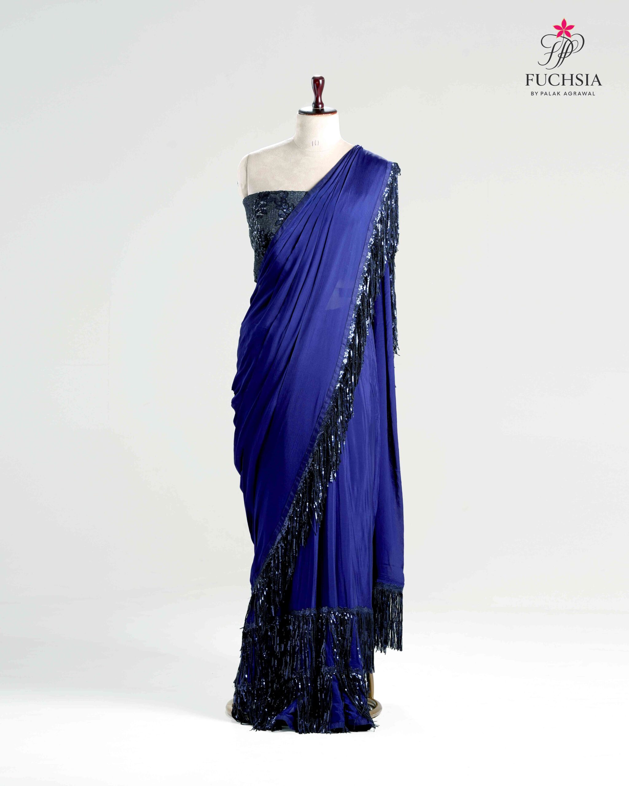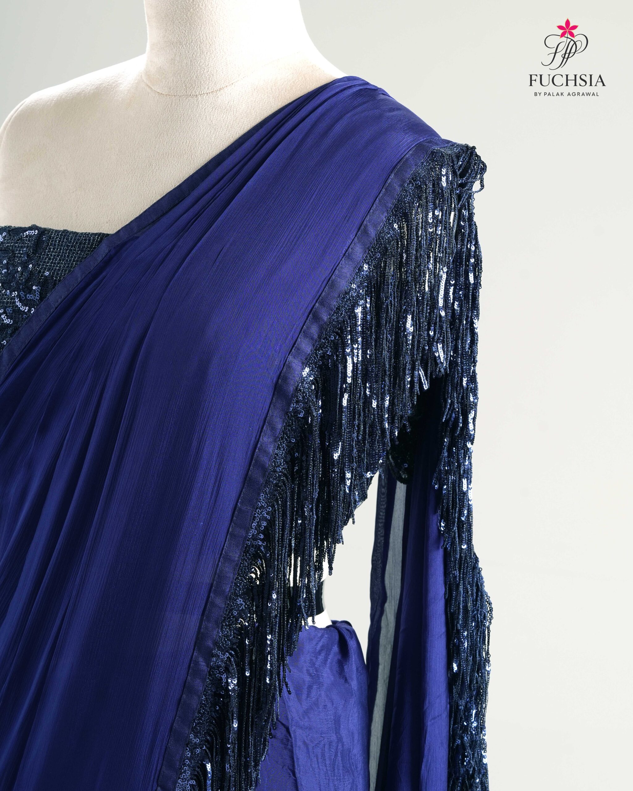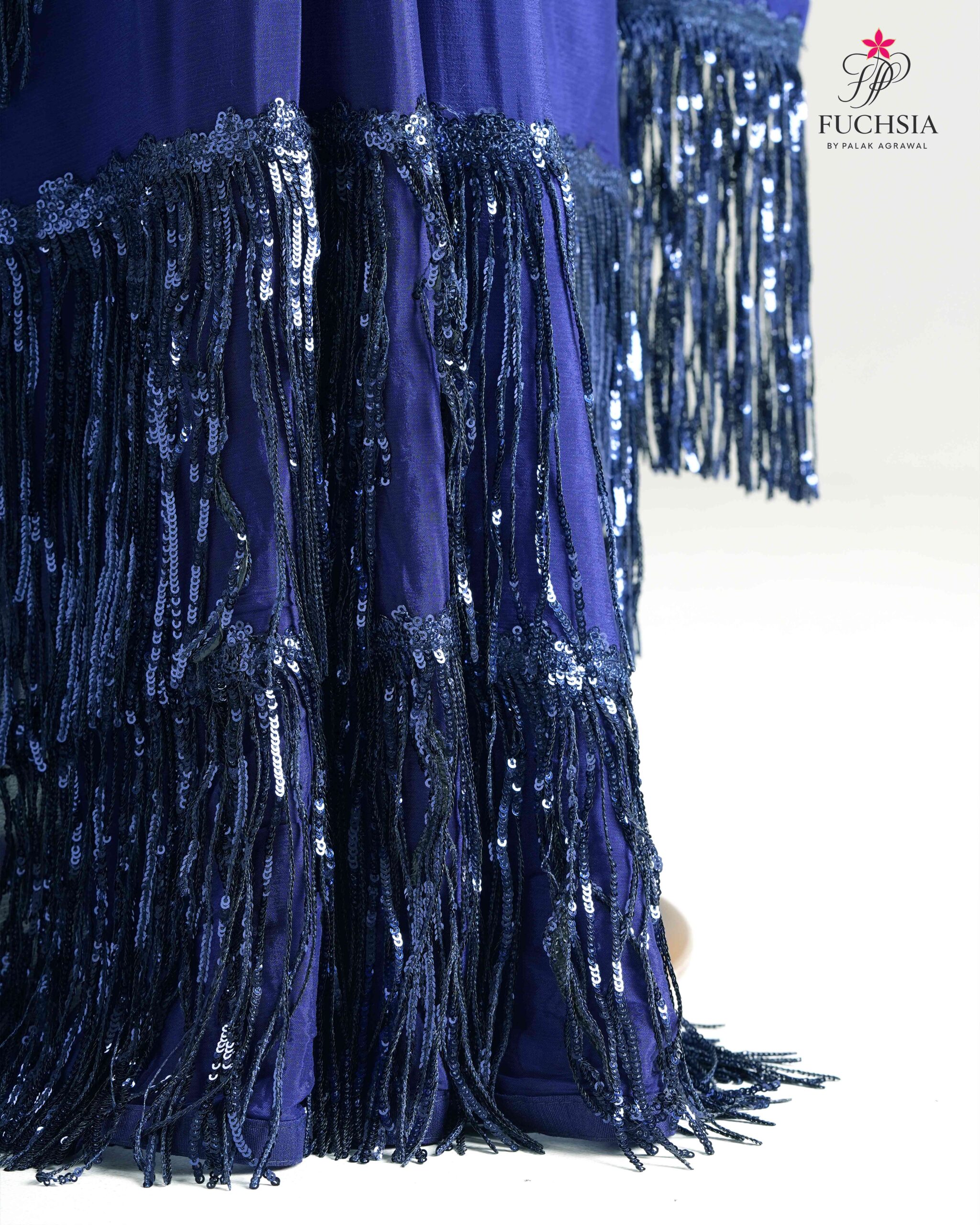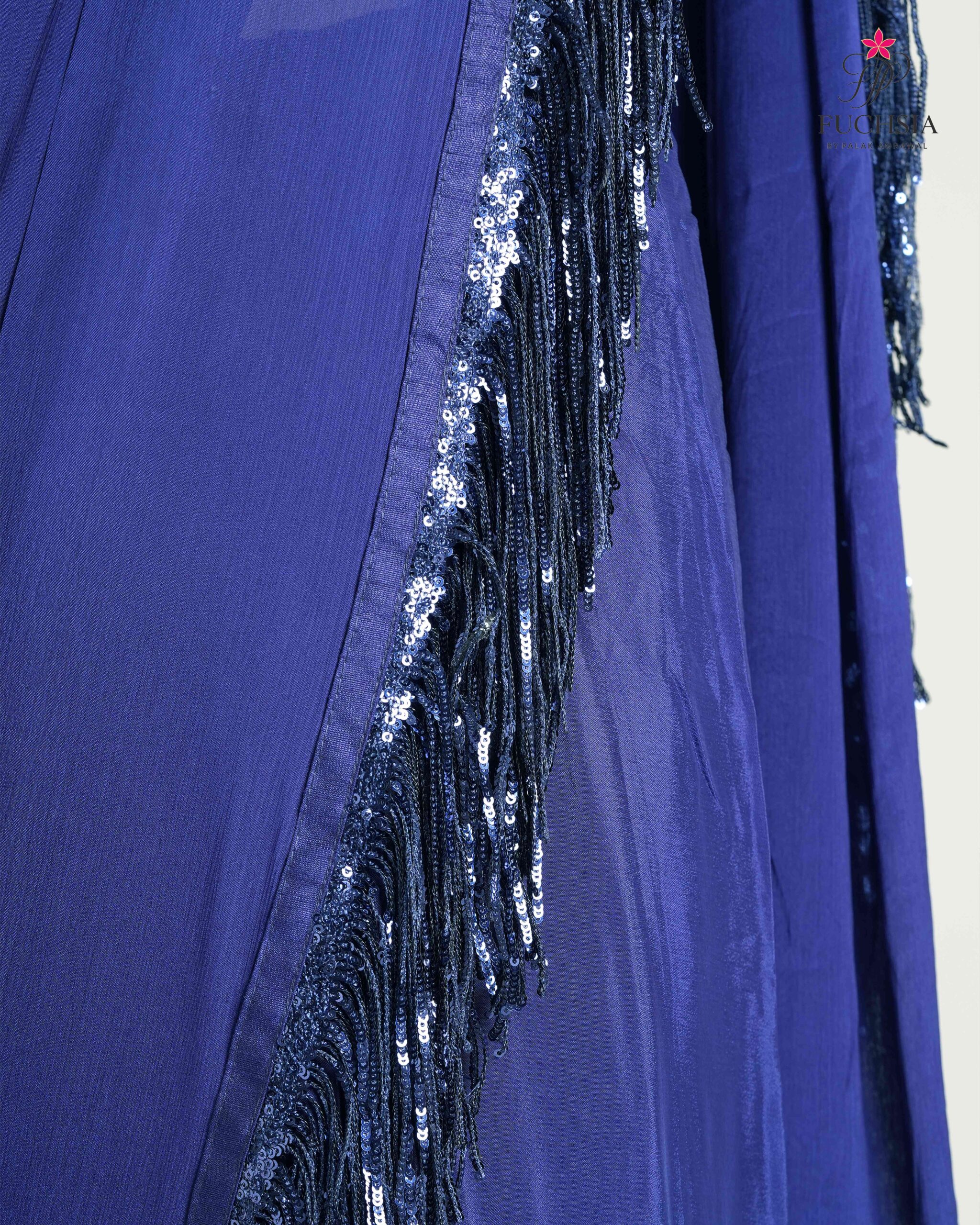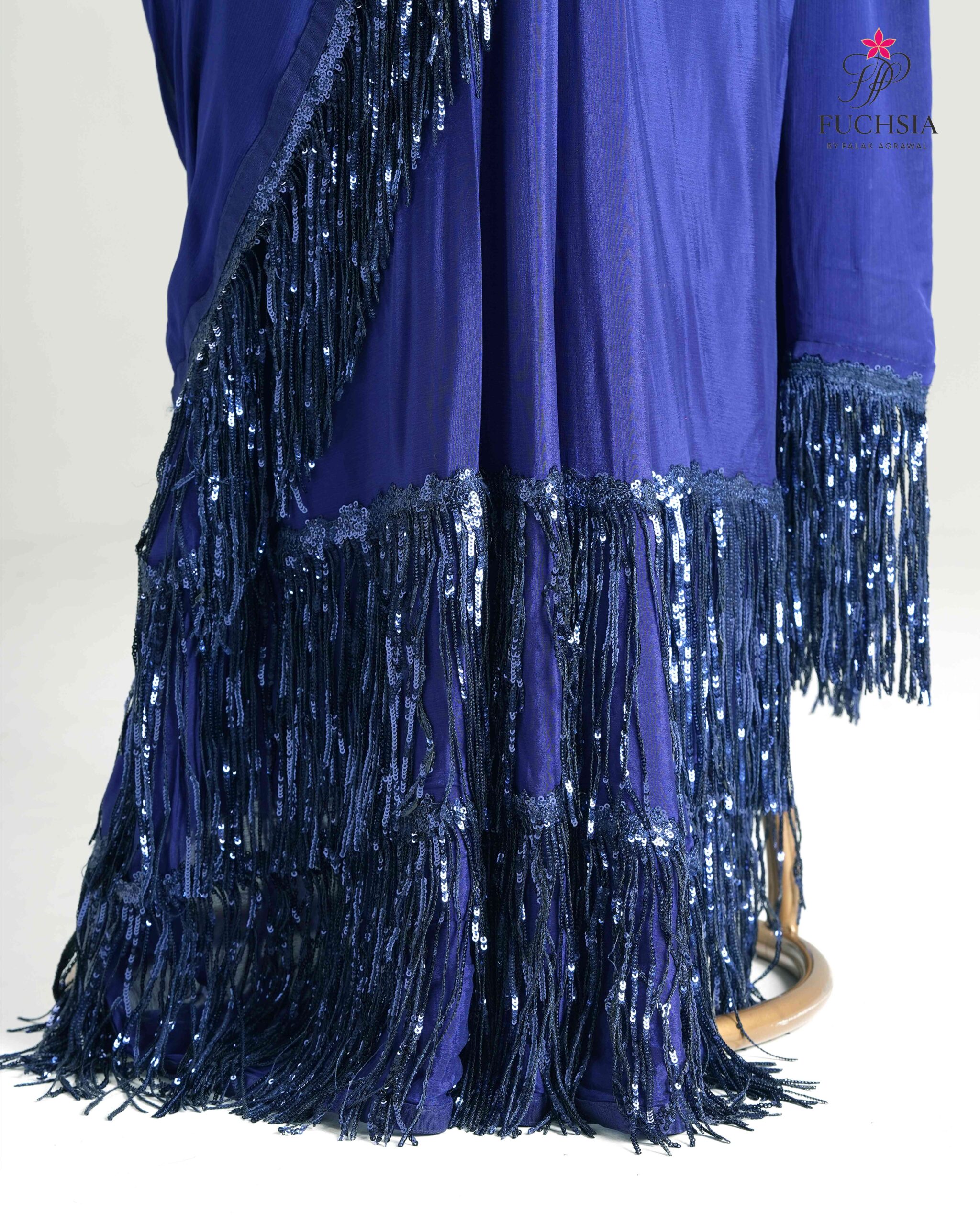 The saree is exquisitely finished with hand-sewn sequin fringe detailing that glimmers with every graceful movement. Light, fluid, and effortlessly elegant — this couture piece is perfect for cocktail evenings, receptions, and festive celebrations.