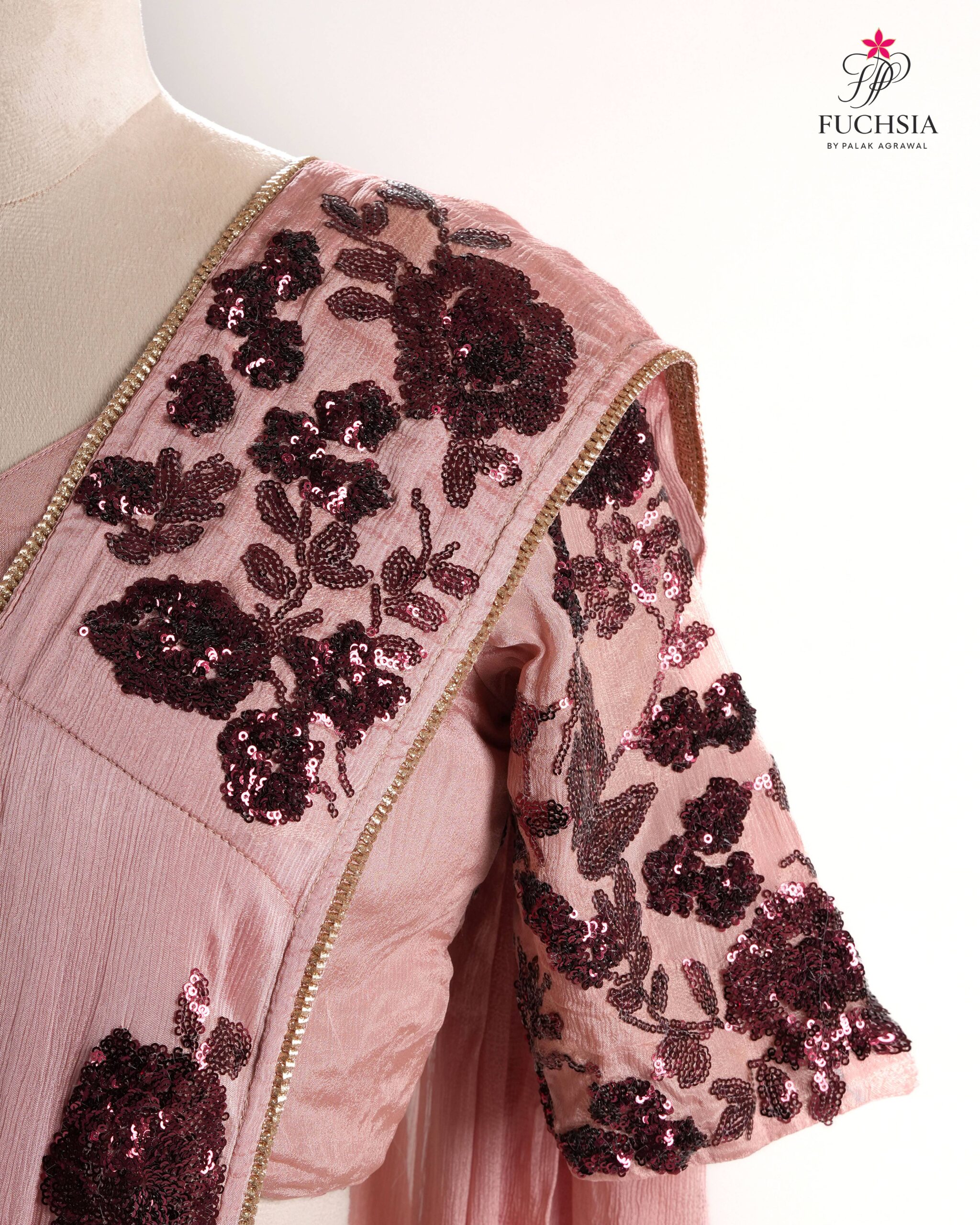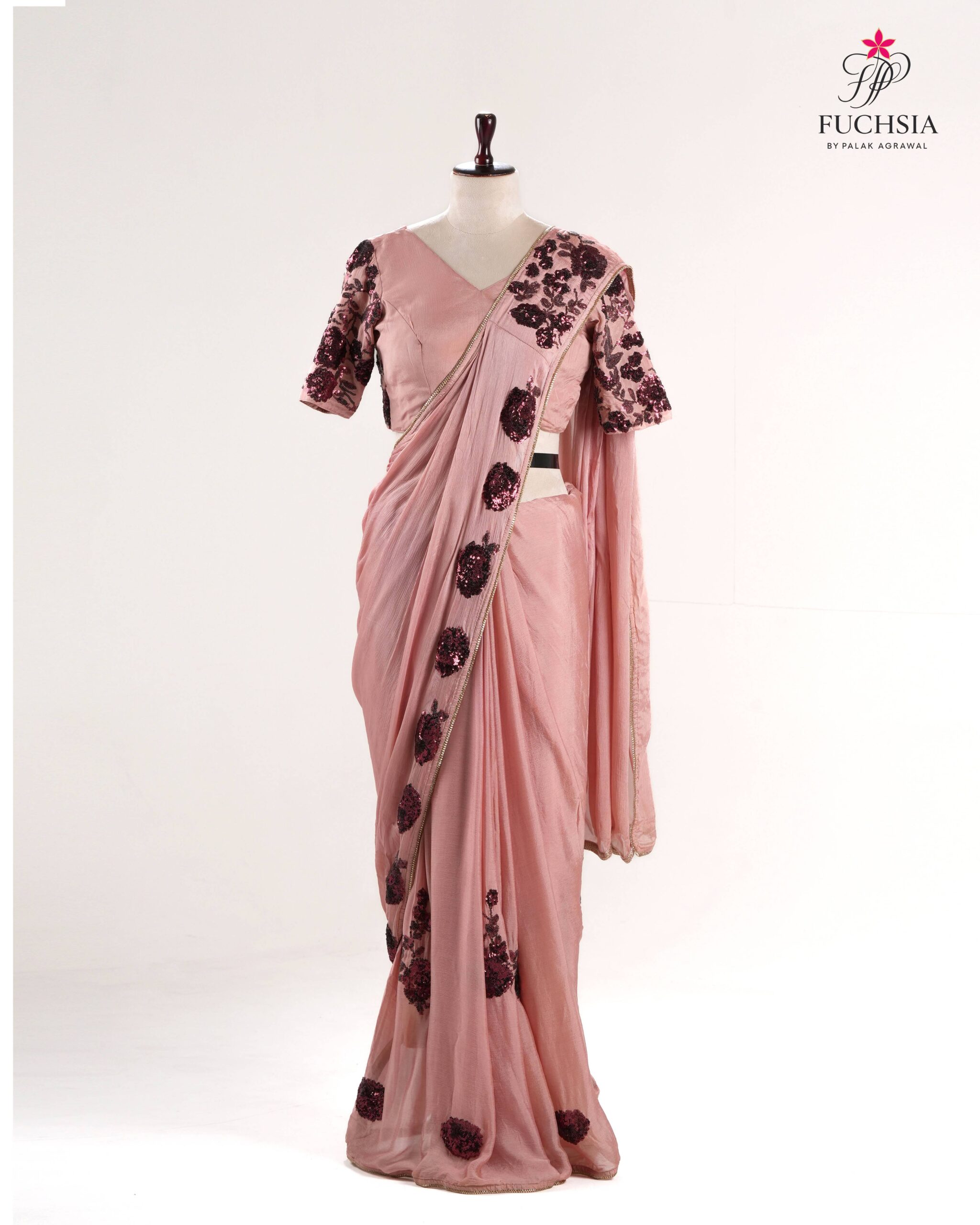 Crafted in Chinnon chiffon, the saree features hand-applied sequin floral motifs in deep wine hues, scattered delicately across the fabric for a soft, refined glow.