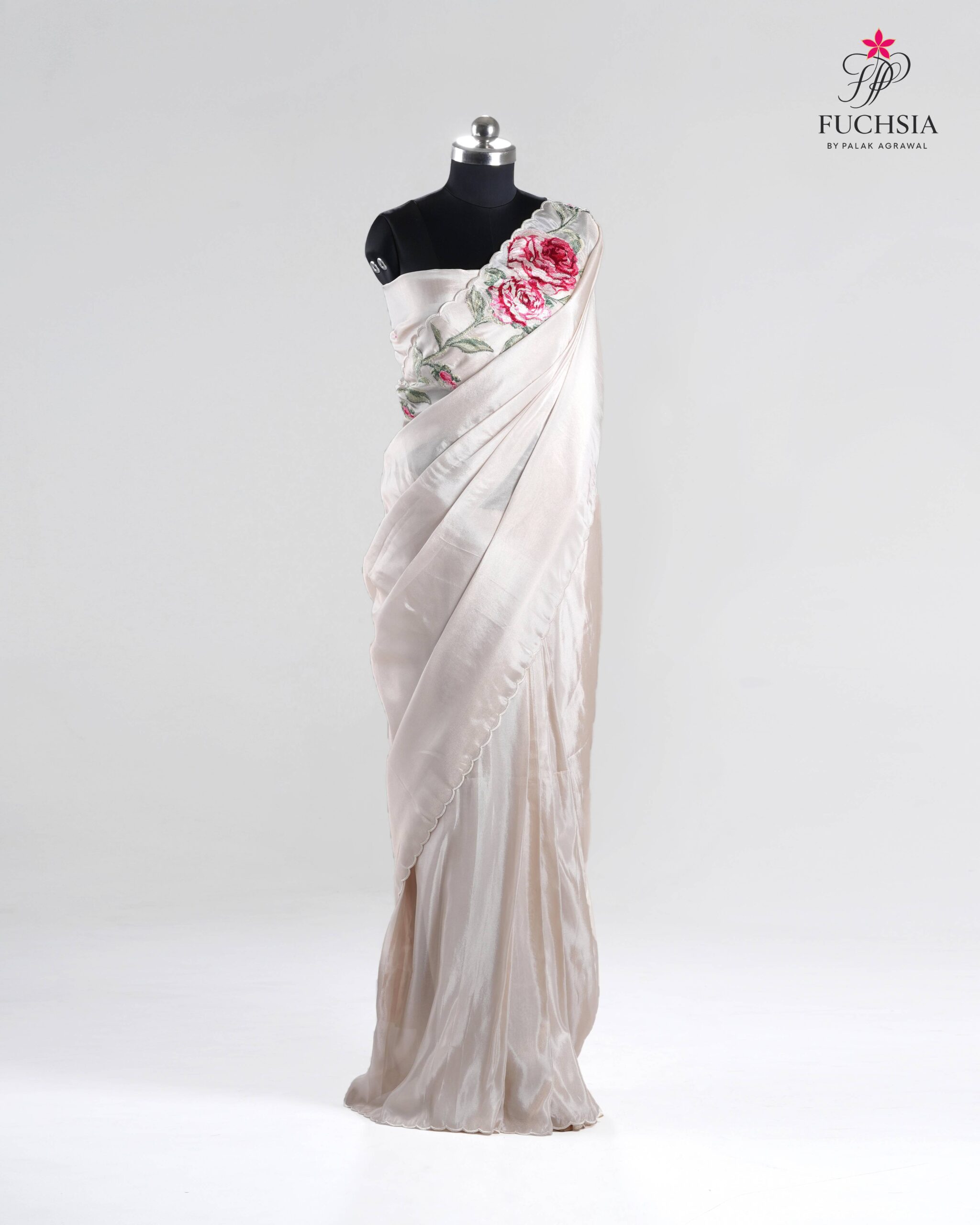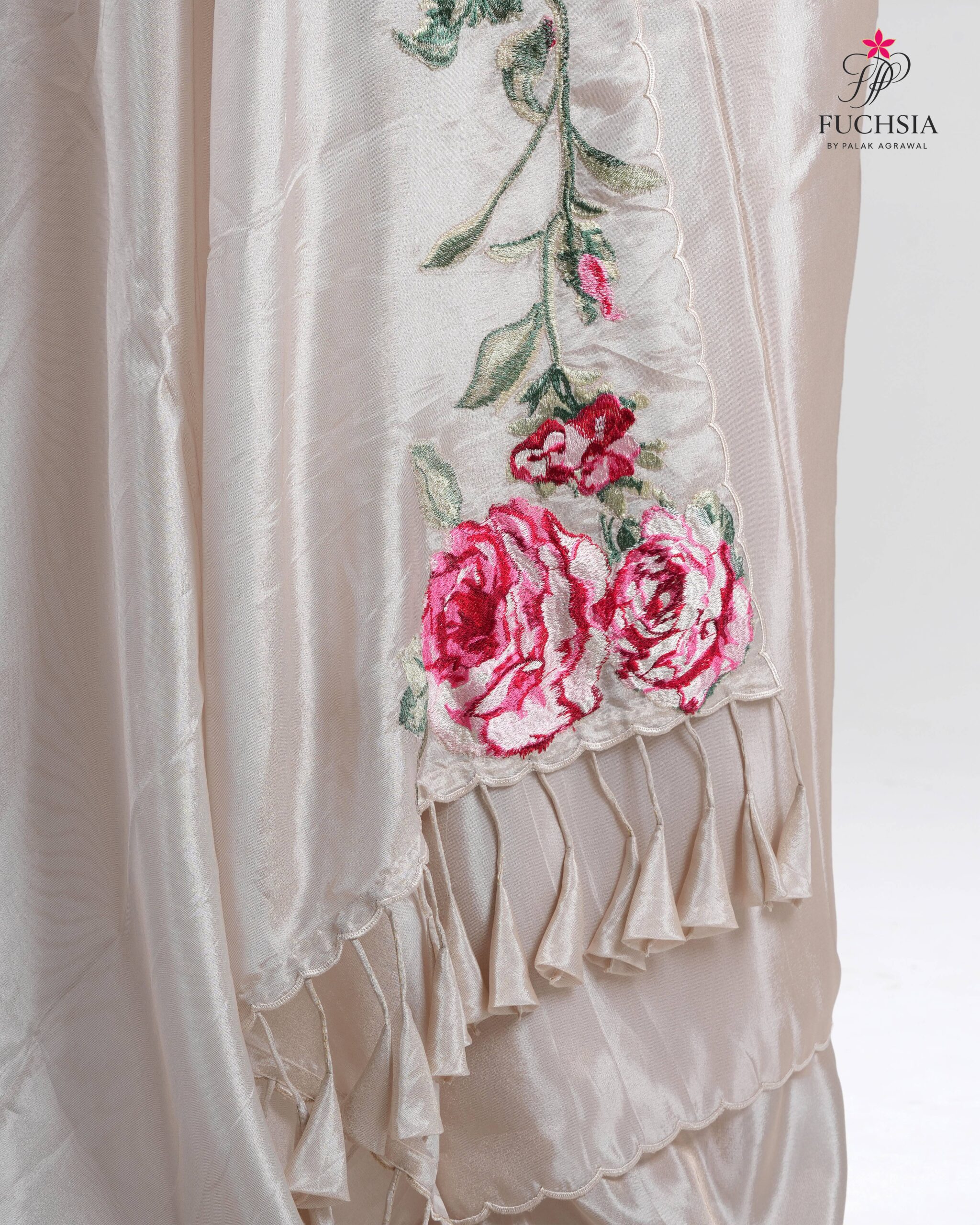 Crafted in soft tissue, the saree flows with luminous elegance, highlighted by rose appliqué embroidery and delicate fabric tassels that add a gentle movement to the drape.