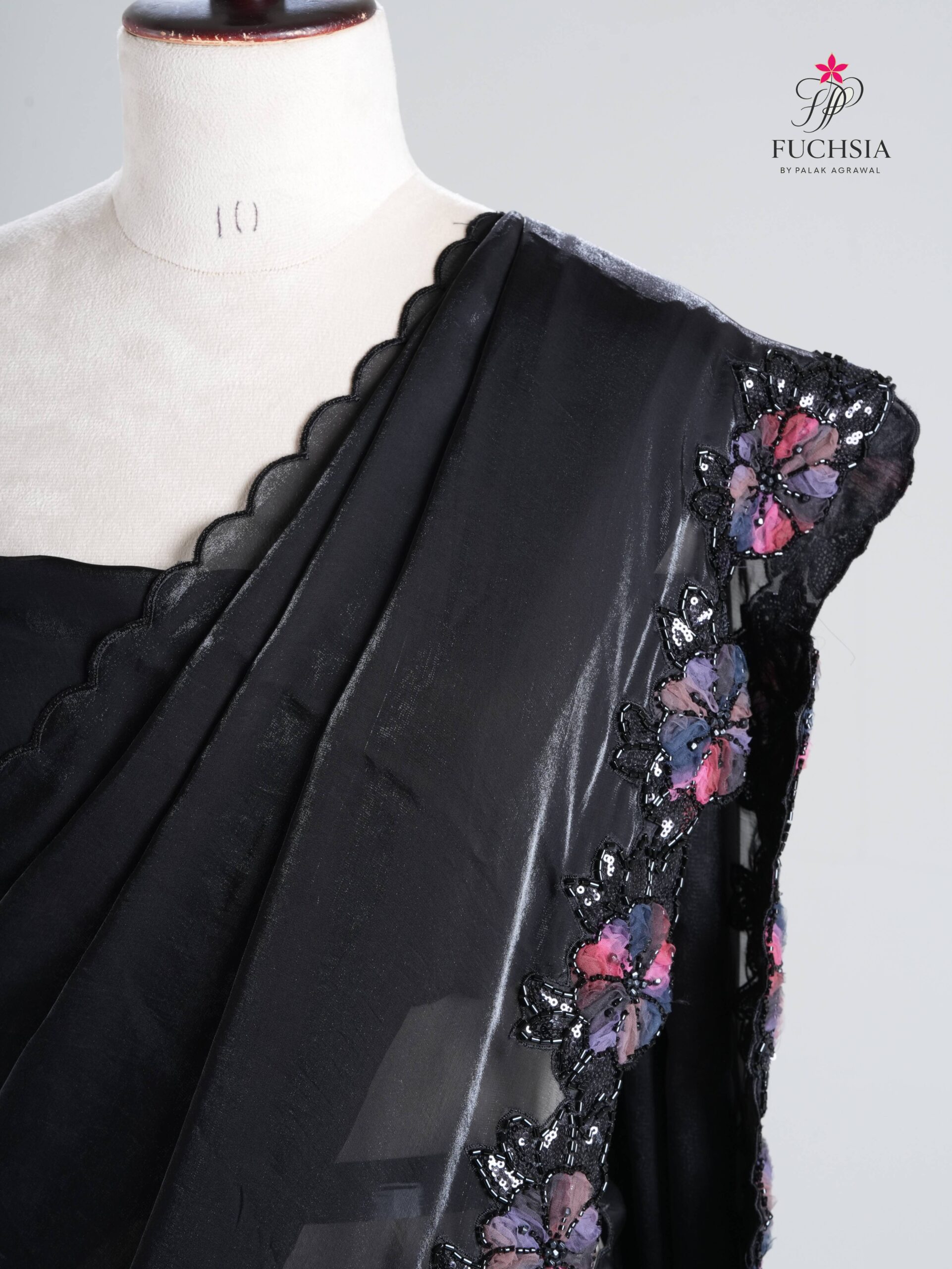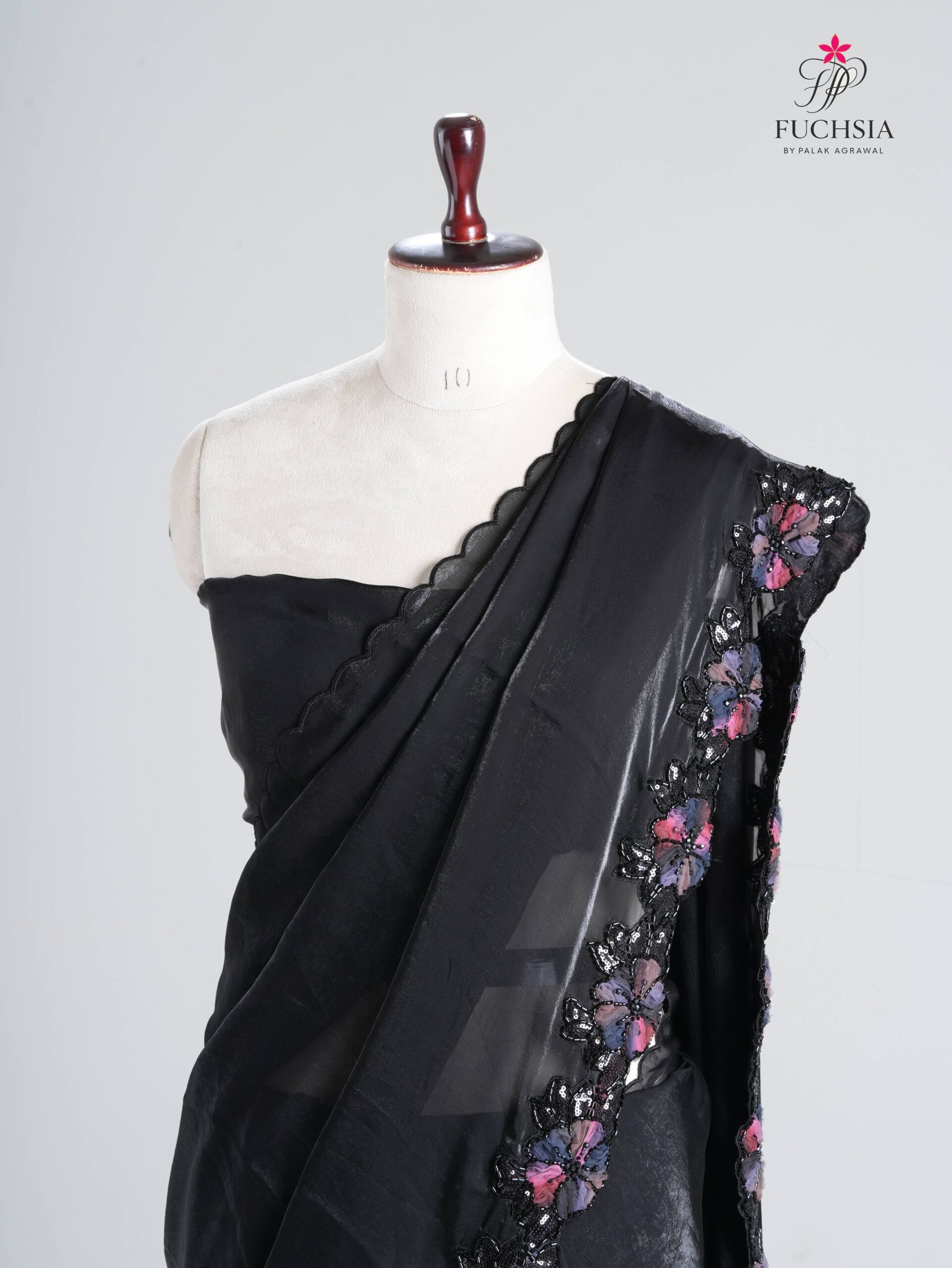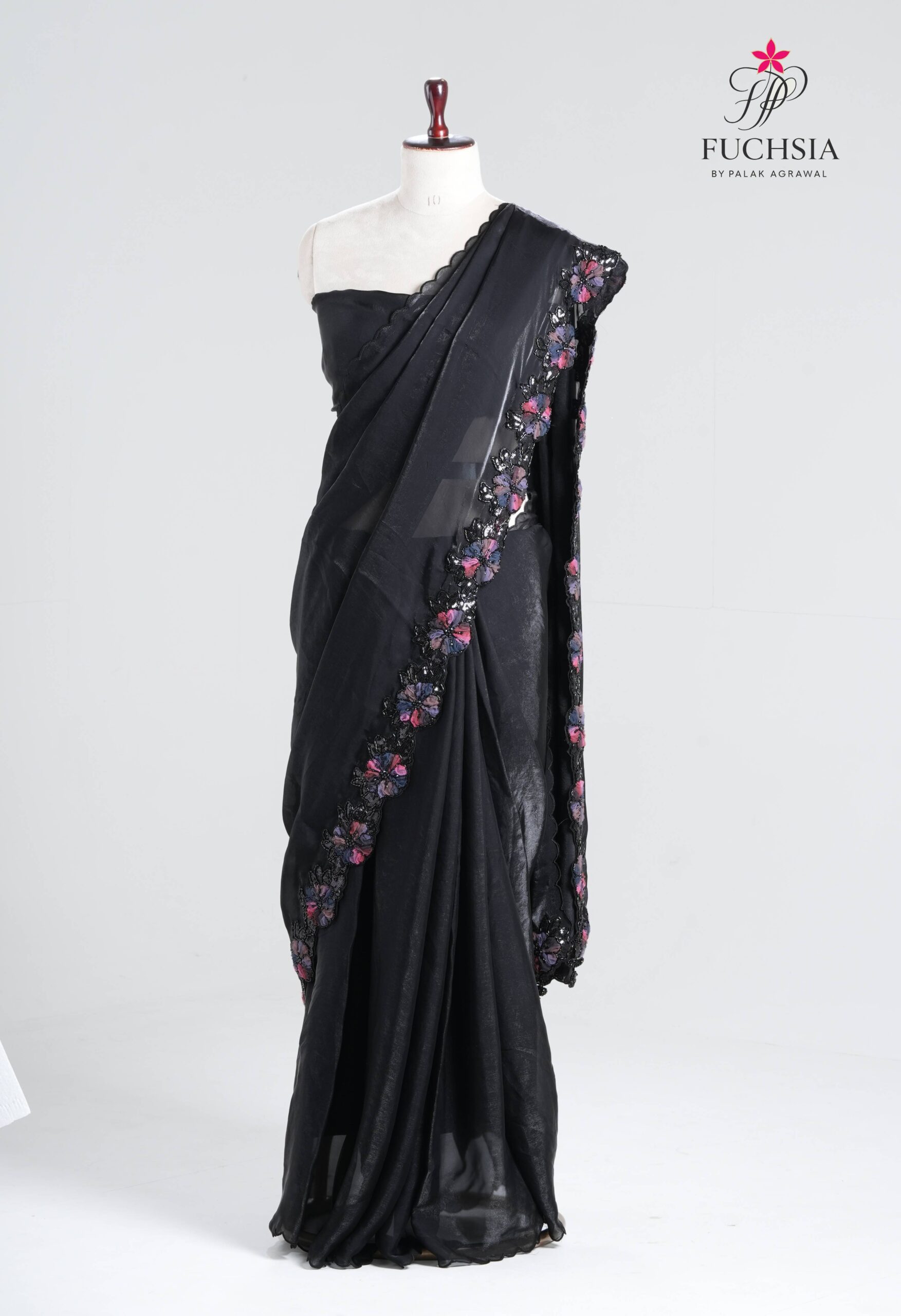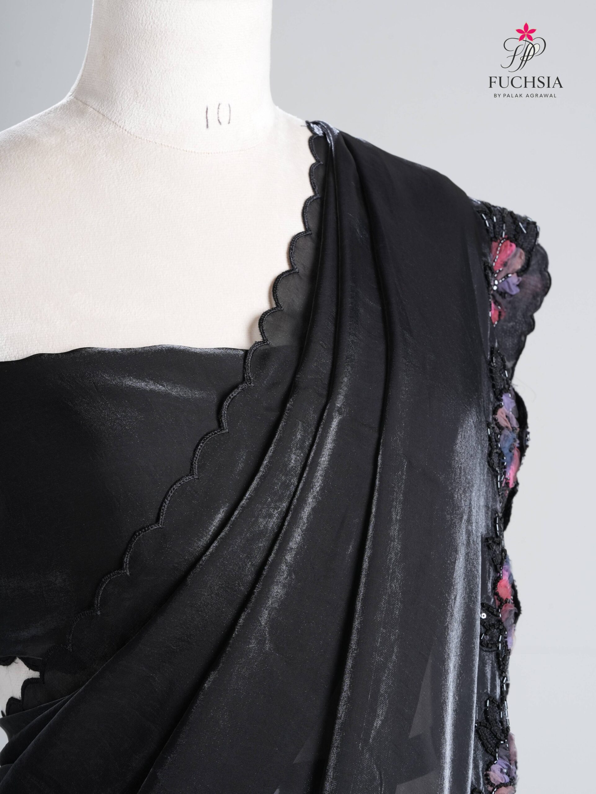 Crafted in glass tissue, this ethereal black drape reflects light with every movement, while the handcrafted floral bead lace adds a refined touch of artistry. Paired with an unstitched glass tissue blouse, it’s the ultimate expression of couture minimalism — sensual yet sophisticated.