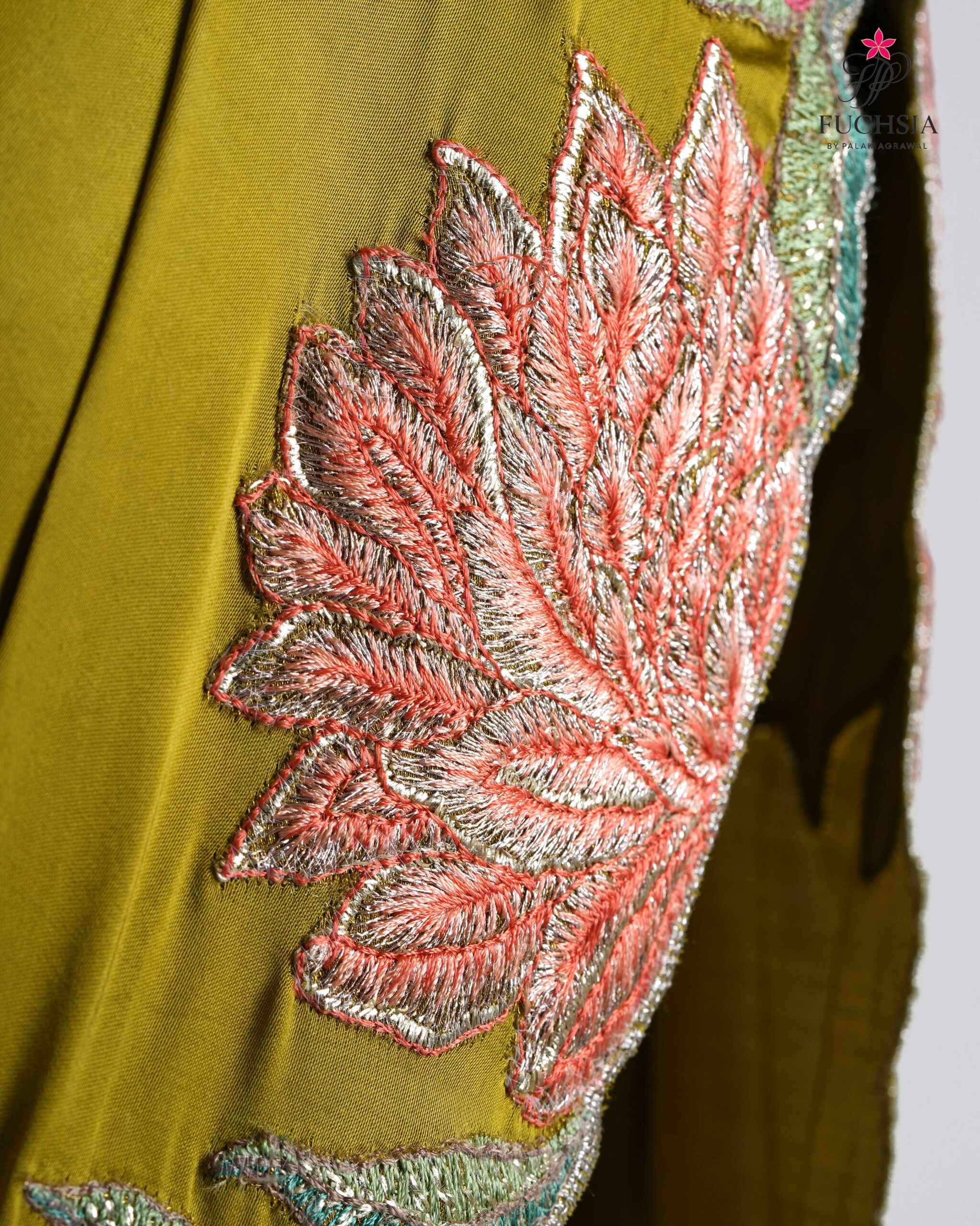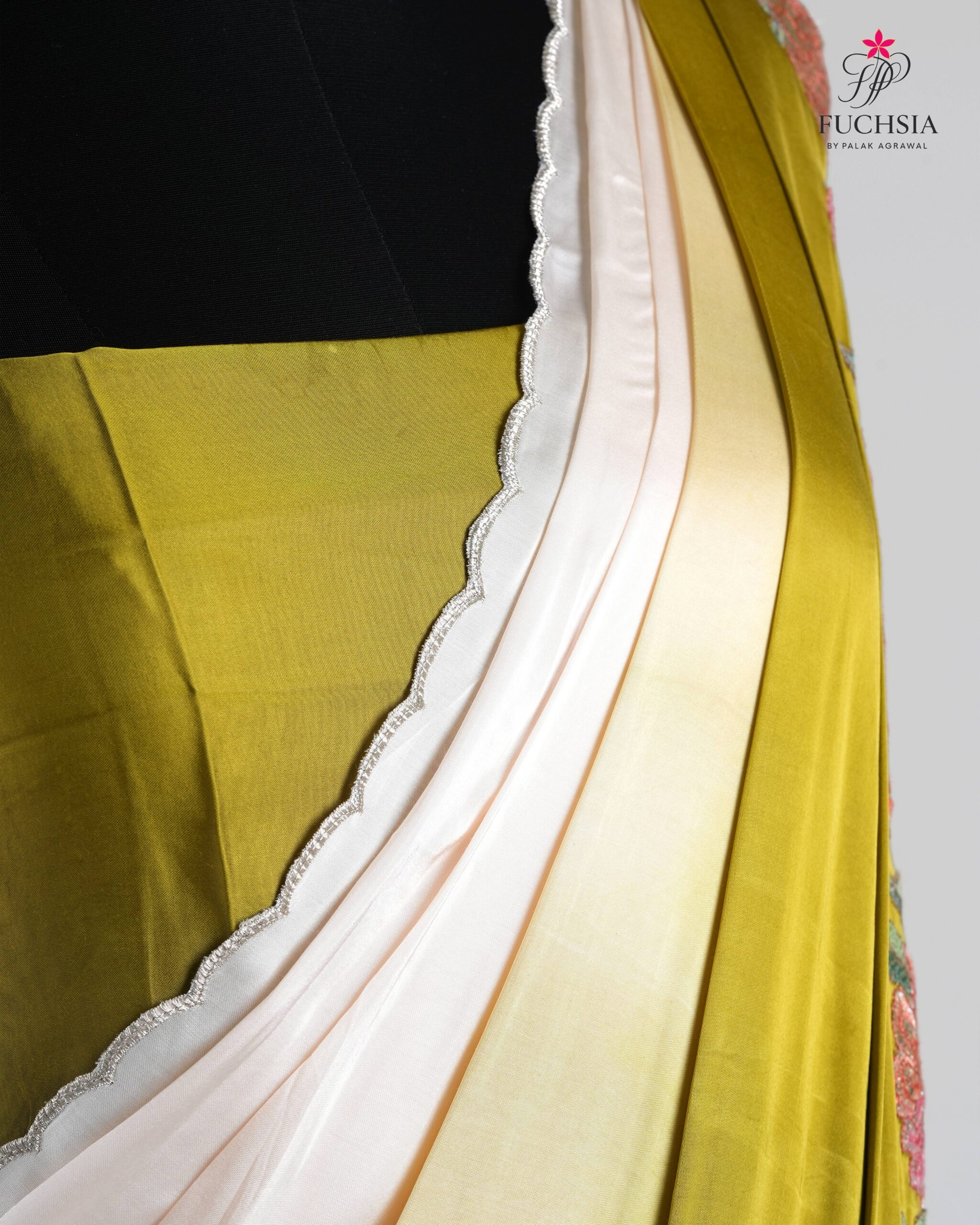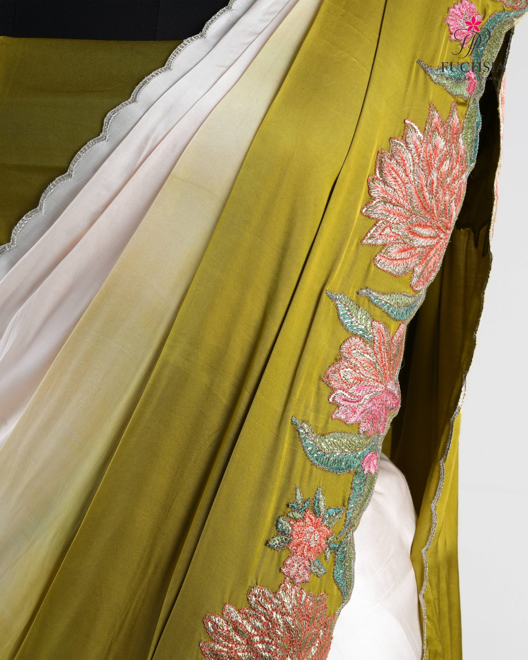 Crafted in mul satin, the saree transitions from off-white to olive, detailed with contrast floral appliqué embroidery and finished with delicate handmade tassels for a touch of movement and grace.