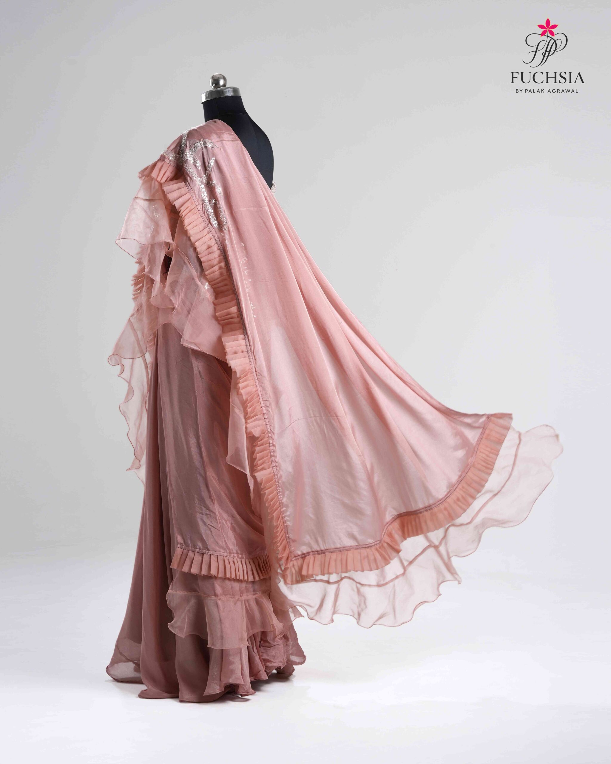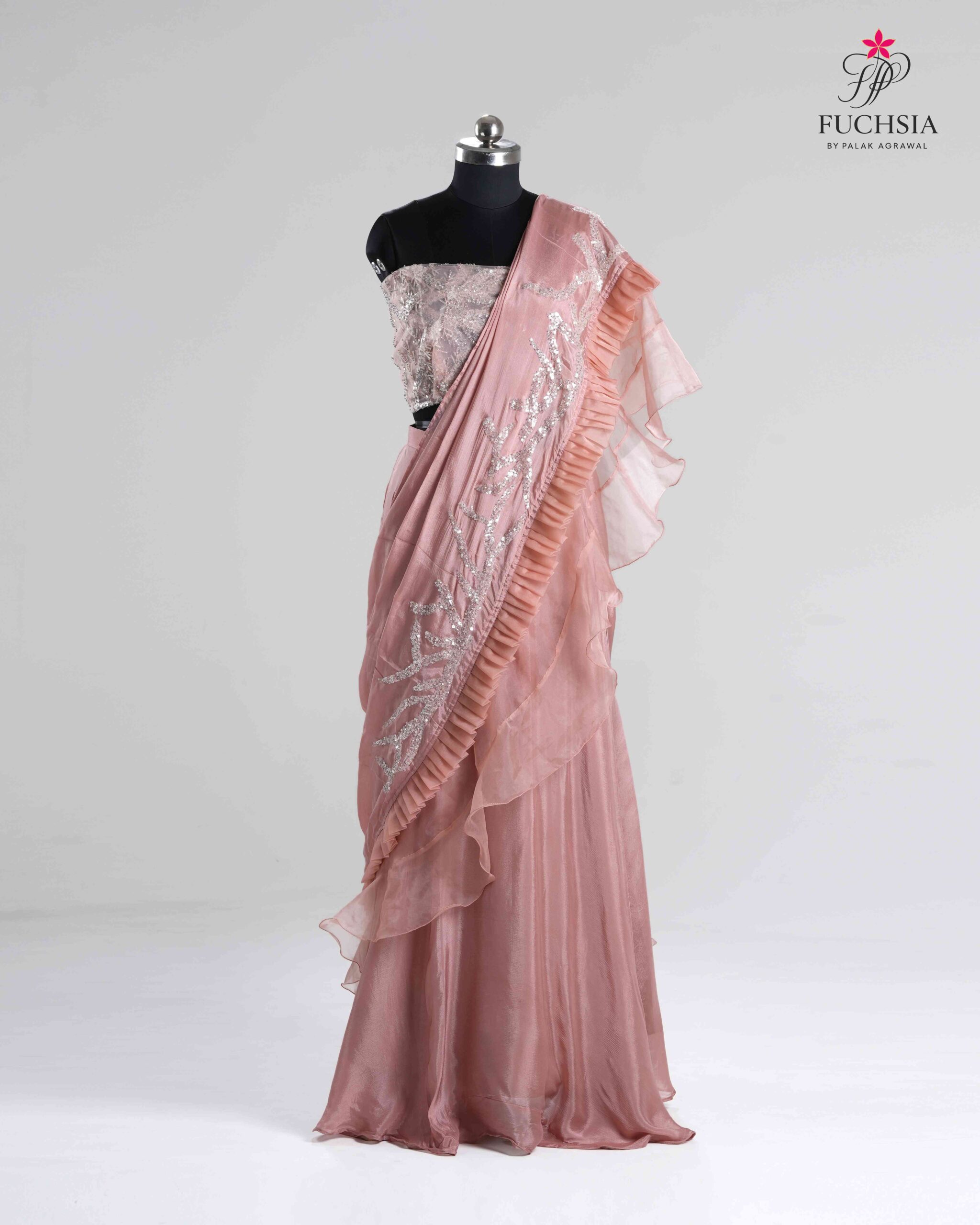 A vision of modern romance, the Rosé Reverie Saree from our Designer Lehenga Ensemble exudes sheer sophistication.