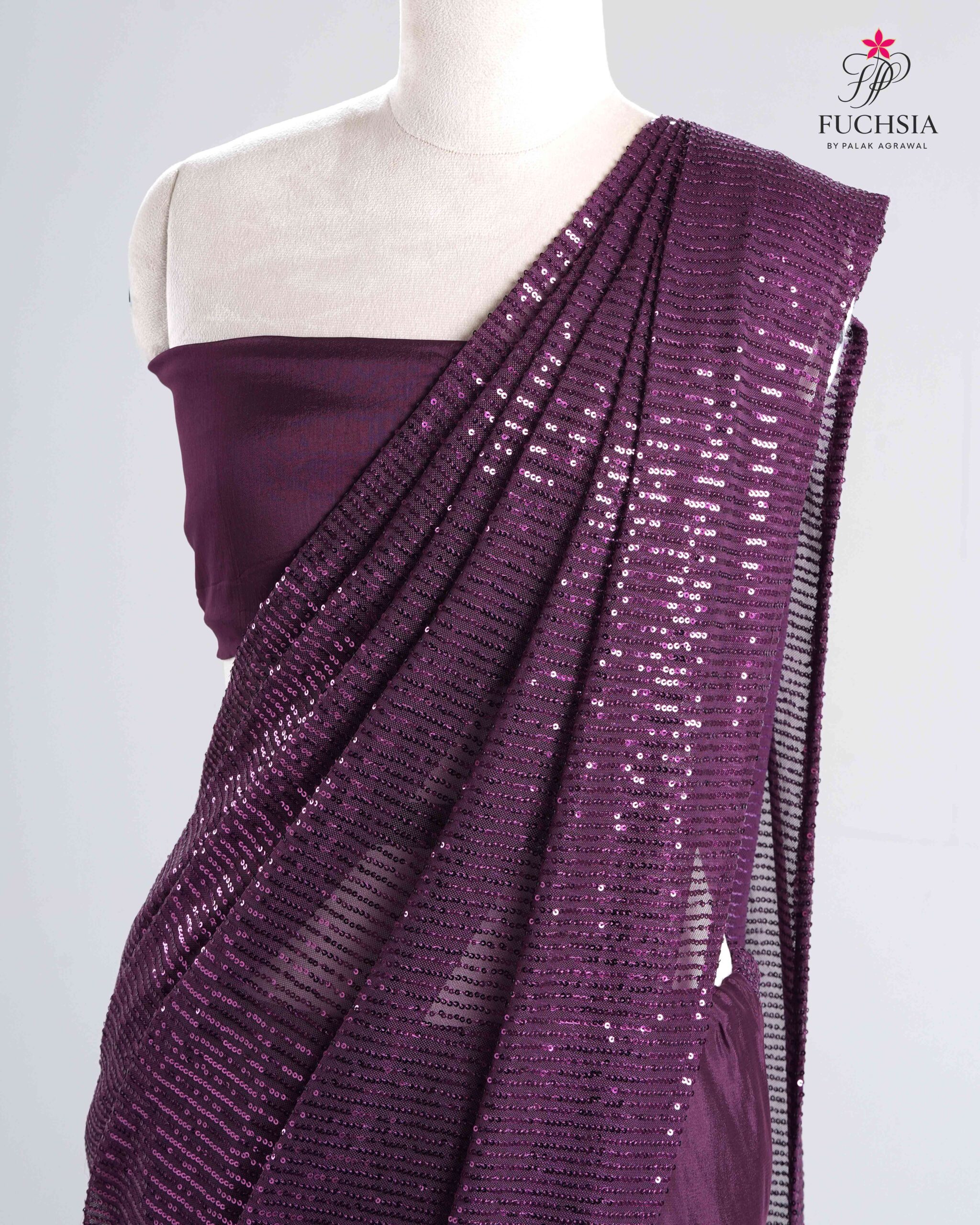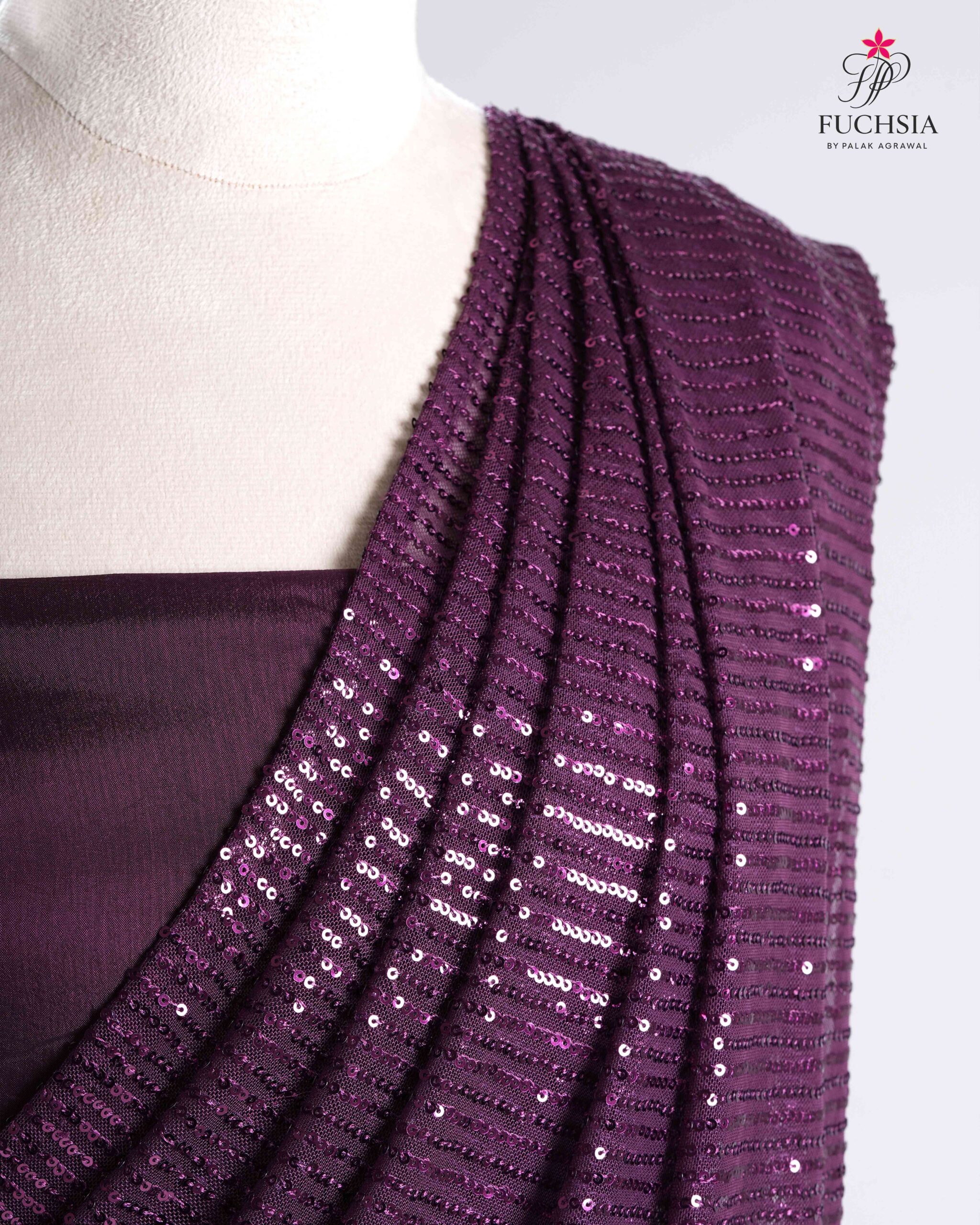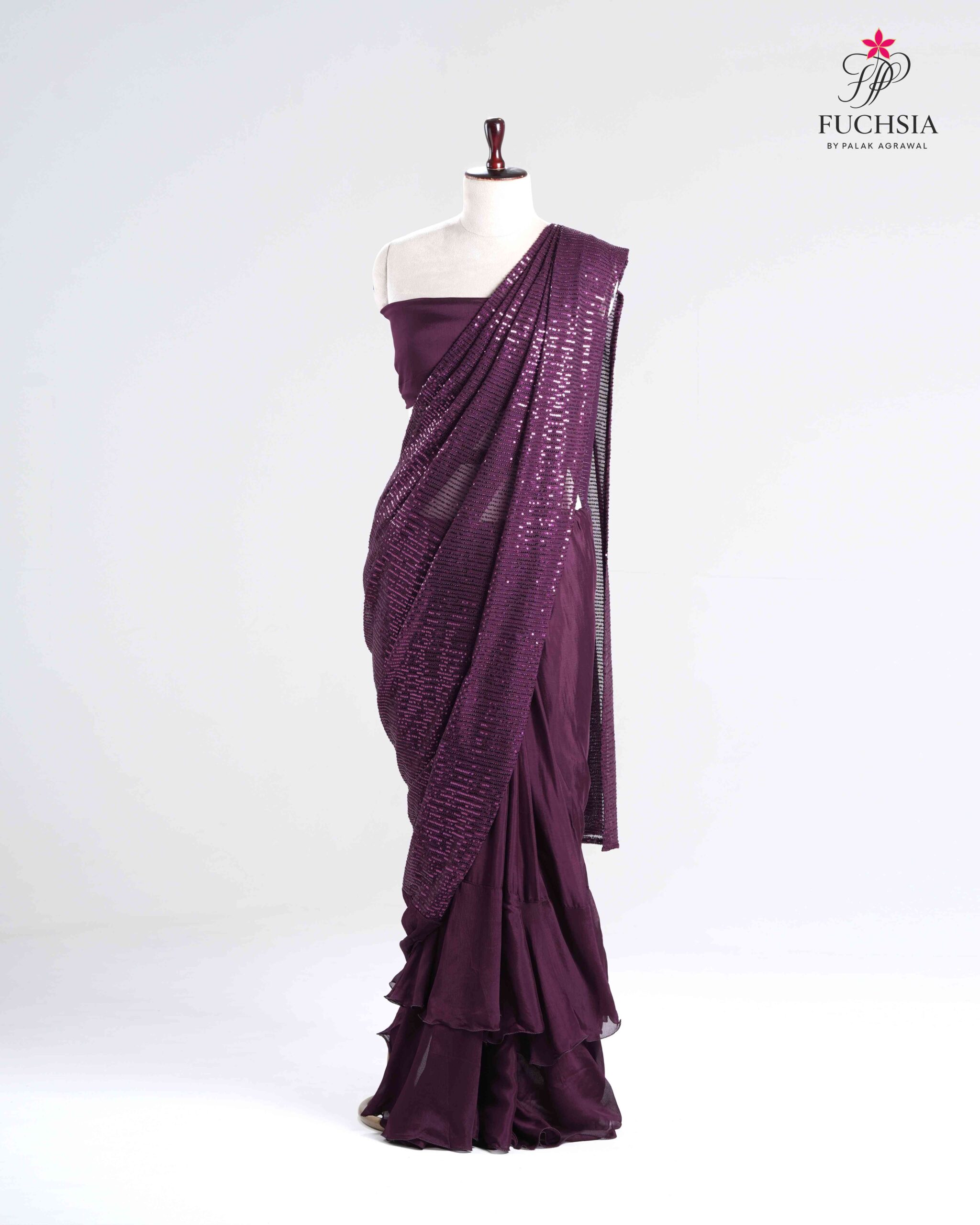 Crafted in chinnon chiffon with a lycra skirt, this ensemble features ruffled pleats and an intricately embroidered sequin drape that moves with graceful fluidity. Designed to flatter the modern muse, it’s perfect for cocktails, receptions, and elegant evening occasions.