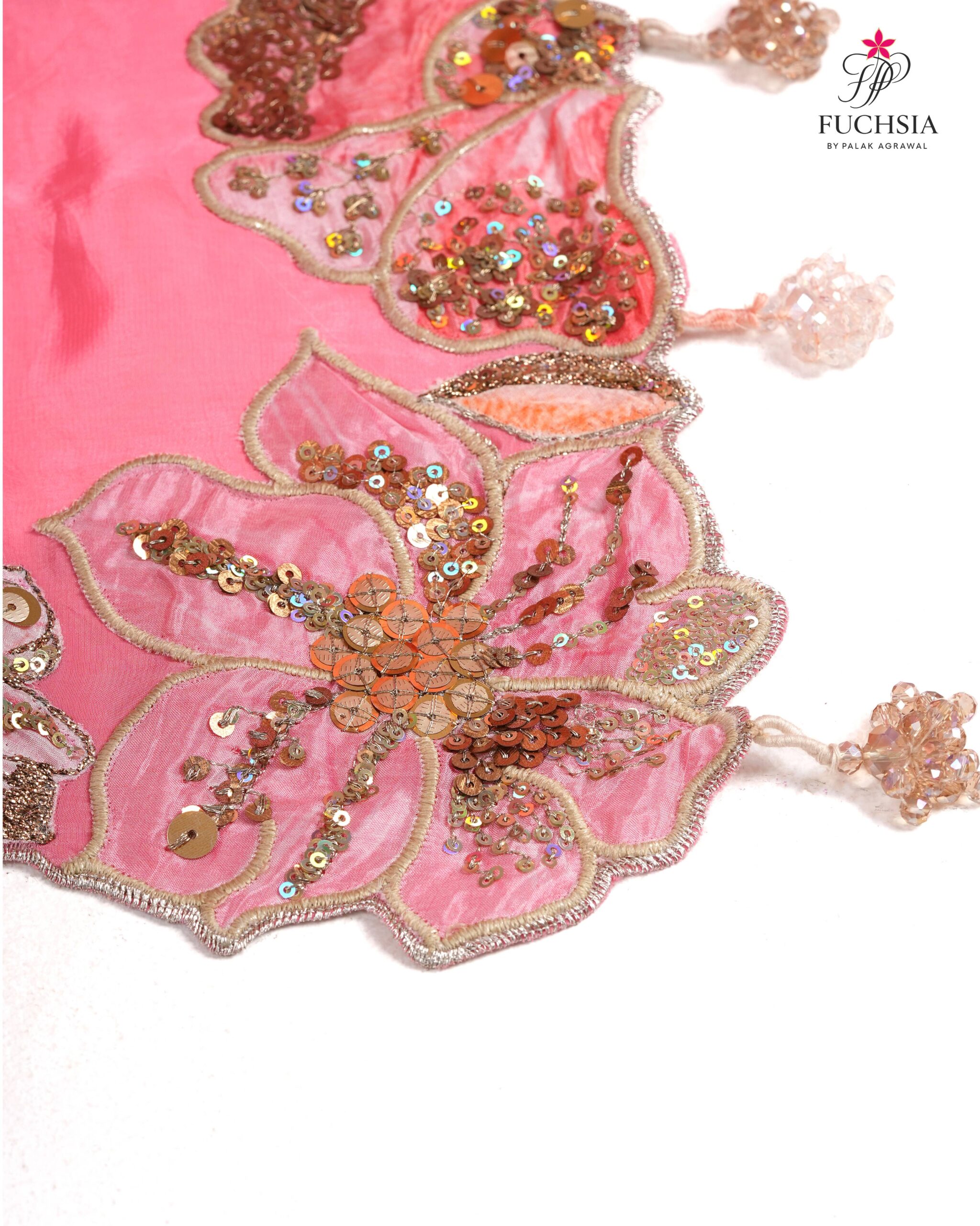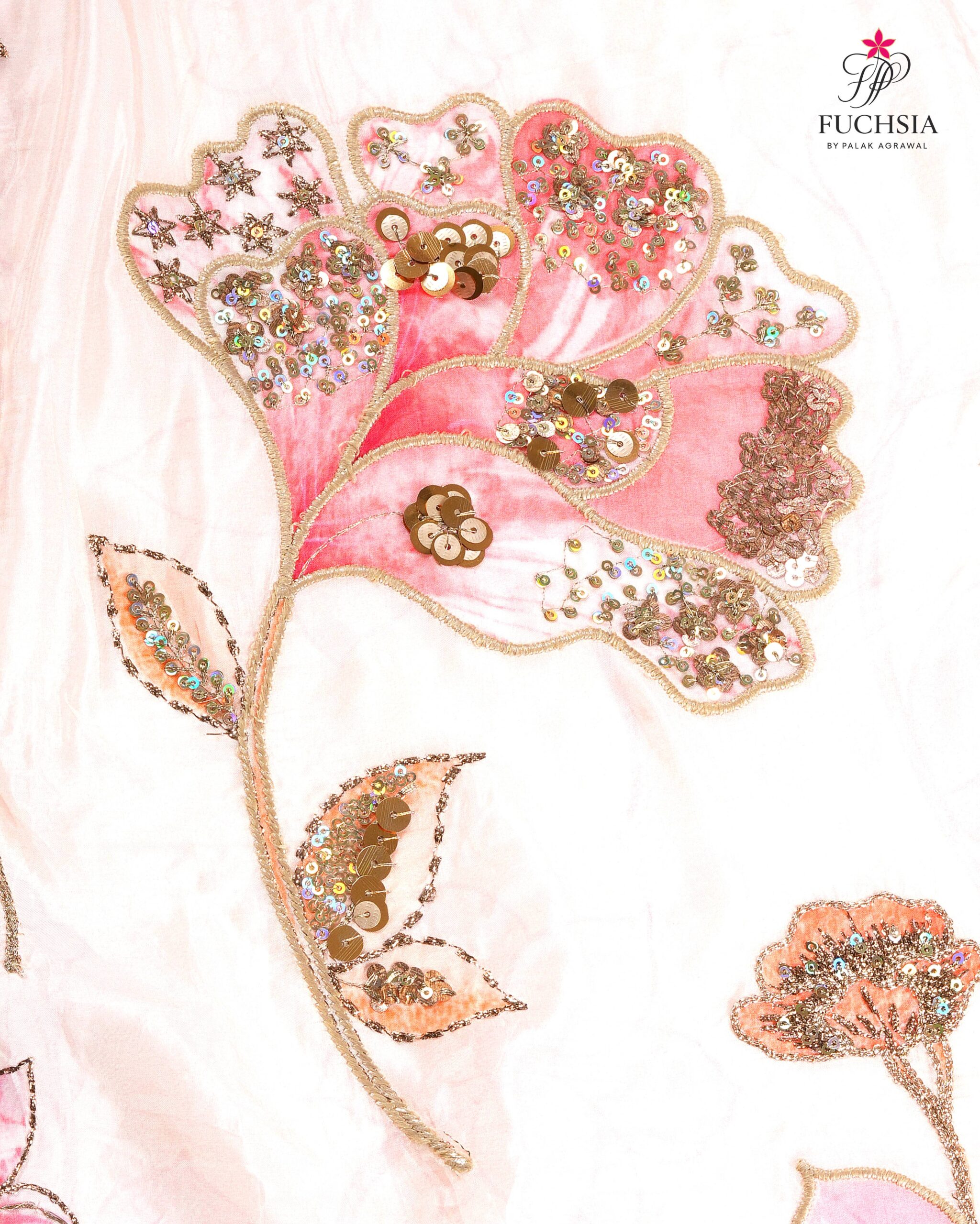 Made in satin crepe, the saree features floral appliqué embroidery with intricate sequin work and scalloped edging that flow seamlessly through the drape. Paired with a blush pink embroidered blouse, it’s a luxurious statement designed for occasions where grace meets glamour.